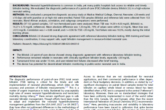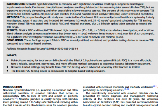 TuttiPubblicazioni scientificheCongressiTuttiPoint-of-care serum bilirubin as an efficient and comparable alternative to hospital based testingDiagnostic performance of point-of-care bilirubin testing with Bilistick 2.0 device at a South Indian clinical siteIttero neonatale: nuovi tools per un percorso diagnostico più efficienteDiagnostic Performance Analysis of the Point-of-Care Bilistick System in Identifying Severe Neonatal Hyperbilirubinemia by a Multi-Country ApproachPatterns of acute bilirubin encephalopathy in Nigeria: a multicenter pre-intervention studyComparison between Bilistick System and transcutaneous bilirubin in assessing total bilirubin serum concentration in jaundiced newbornsNeonatal Jaundice in Low- and Middle-Income Countries: Lessons and Future Directions from the 2015 Don Ostrow Trieste Yellow RetreatBilistick: A Low-Cost Point-of-Care System to Measure Total Plasma BilirubinBilistick® System as a reliable, cost-effective tool for predicting the need of treatment for hyperbilirubinemia in Low Middle Income CountriesBilistick: An Accurate Low Cost Point-Of-Care Option for Total Bilirubin Determination in LMICSEmpowering Mothers Prevents Kernicterus in NigeriaPrevalence and Root Causes of Kernicterus in NigeriaPubblicazioni scientifichePoint-of-care serum bilirubin as an efficient and comparable alternative to hospital based testingDiagnostic performance of point-of-care bilirubin testing with Bilistick 2.0 device at a South Indian clinical siteIttero neonatale: nuovi tools per un percorso diagnostico più efficienteDiagnostic Performance Analysis of the Point-of-Care Bilistick System in Identifying Severe Neonatal Hyperbilirubinemia by a Multi-Country ApproachPatterns of acute bilirubin encephalopathy in Nigeria: a multicenter pre-intervention studyComparison between Bilistick System and transcutaneous bilirubin in assessing total bilirubin serum concentration in jaundiced newbornsNeonatal Jaundice in Low- and Middle-Income Countries: Lessons and Future Directions from the 2015 Don Ostrow Trieste Yellow RetreatBilistick: A Low-Cost Point-of-Care System to Measure Total Plasma BilirubinCongressiBilistick® System as a reliable, cost-effective tool for predicting the need of treatment for hyperbilirubinemia in Low Middle Income CountriesBilistick: An Accurate Low Cost Point-Of-Care Option For Total Bilirubin Determination In LmicsEmpowering Mothers Prevents Kernicterus in NigeriaPrevalence and Root Causes of Kernicterus in Nigeria Diagnostic performance of point-of-care bilirubin testing with Bilistick 2.0 device at a South Indian clinical site Ittero neonatale: nuovi tools per un percorso diagnostico più efficiente Diagnostic Performance Analysis of the Point-of-Care Bilistick System in Identifying Severe Neonatal Hyperbilirubinemia by a Multi-Country Approach Patterns of acute bilirubin encephalopathy in Nigeria: a multicenter pre-intervention study READ MORE Neonatal Jaundice in Low- and Middle-Income Countries: Lessons and Future Directions from the 2015 Don Ostrow Trieste Yellow Retreat Bilistick: A Low-Cost Point-of-Care System to Measure Total Plasma Bilirubin Comparison between Bilistick System and transcutaneous bilirubin in assessing total bilirubin serum concentration in jaundiced newborns Comparison between Bilistick System and transcutaneous bilirubin in assessing total bilirubin serum concentration in jaundiced newborns Bilistick® System as a reliable, cost-effective tool for predicting the need of treatment for hyperbilirubinemia in Low Middle Income Countries Bilistick: An Accurate Low Cost Point-Of-Care Option for Total Bilirubin Determination in LMICs Empowering Mothers Prevents Kernicterus in Nigeria Prevalence and Root Causes of Kernicterus in Nigeria ContattaciSe desideri contattarci per l'acquisto o per chiarimenti tecnici sul Sistema Bilistick®, invia un messaggio compilando il seguente modulo. Accetto tutte le condizioni dell’informativa sulla * Campo obbligatorio